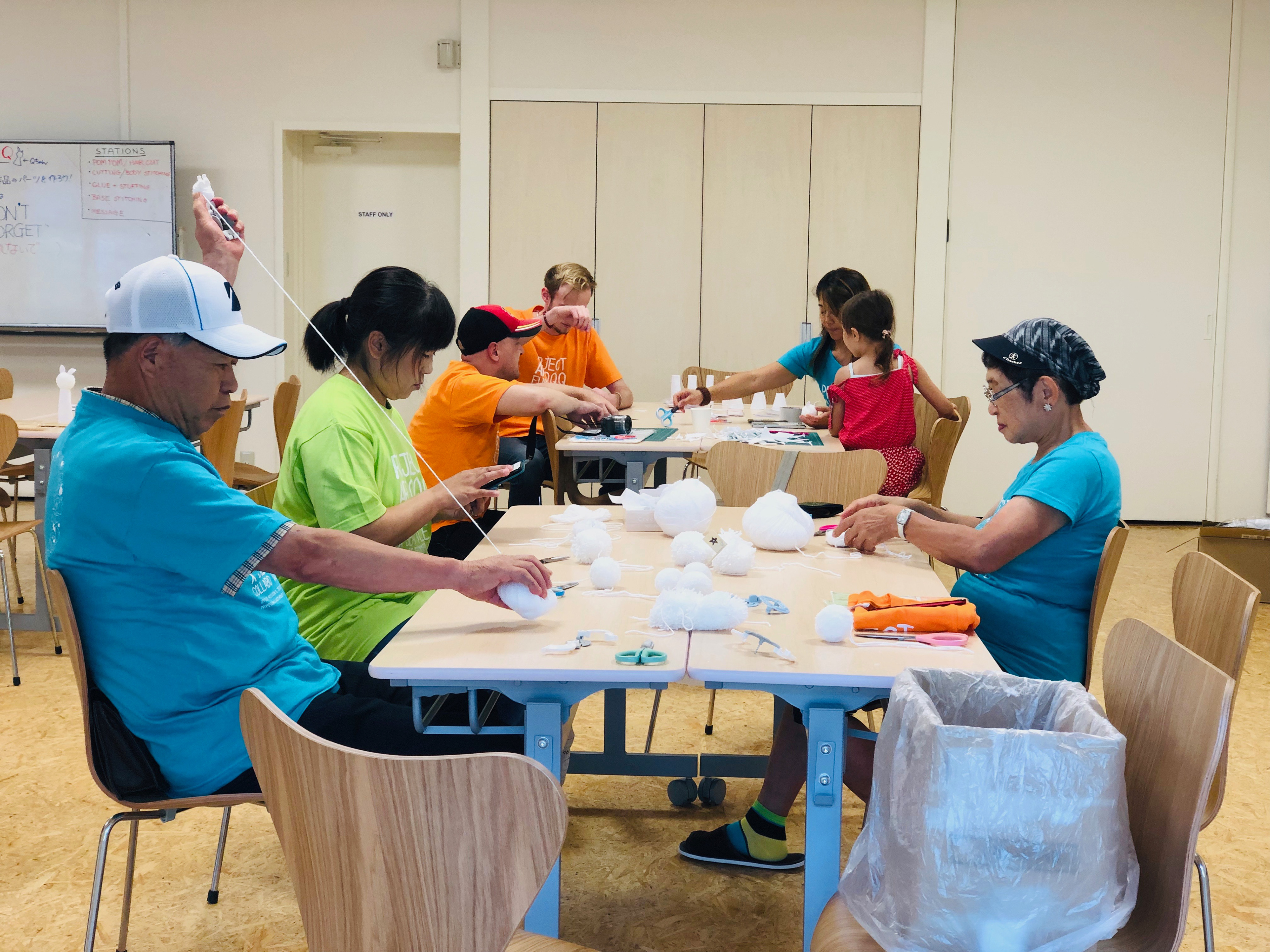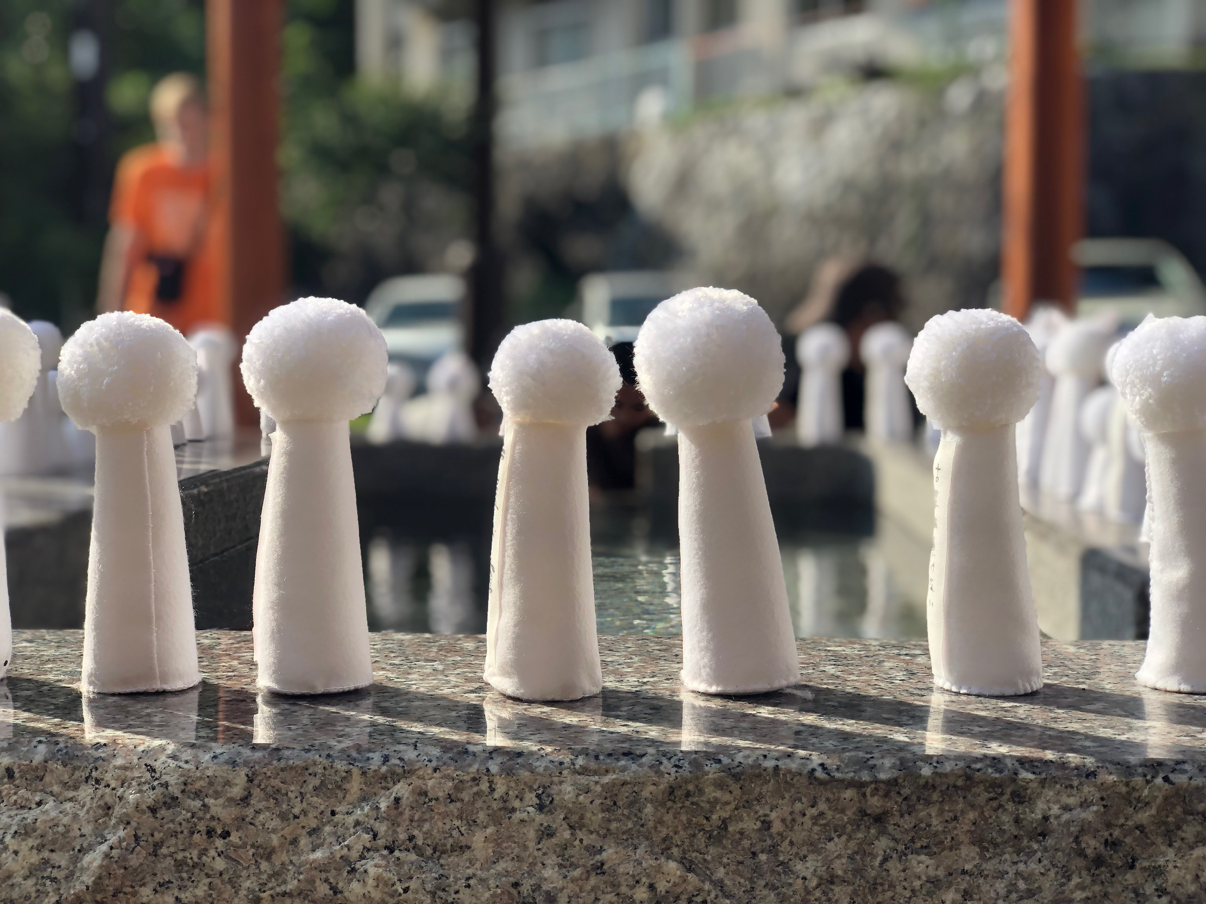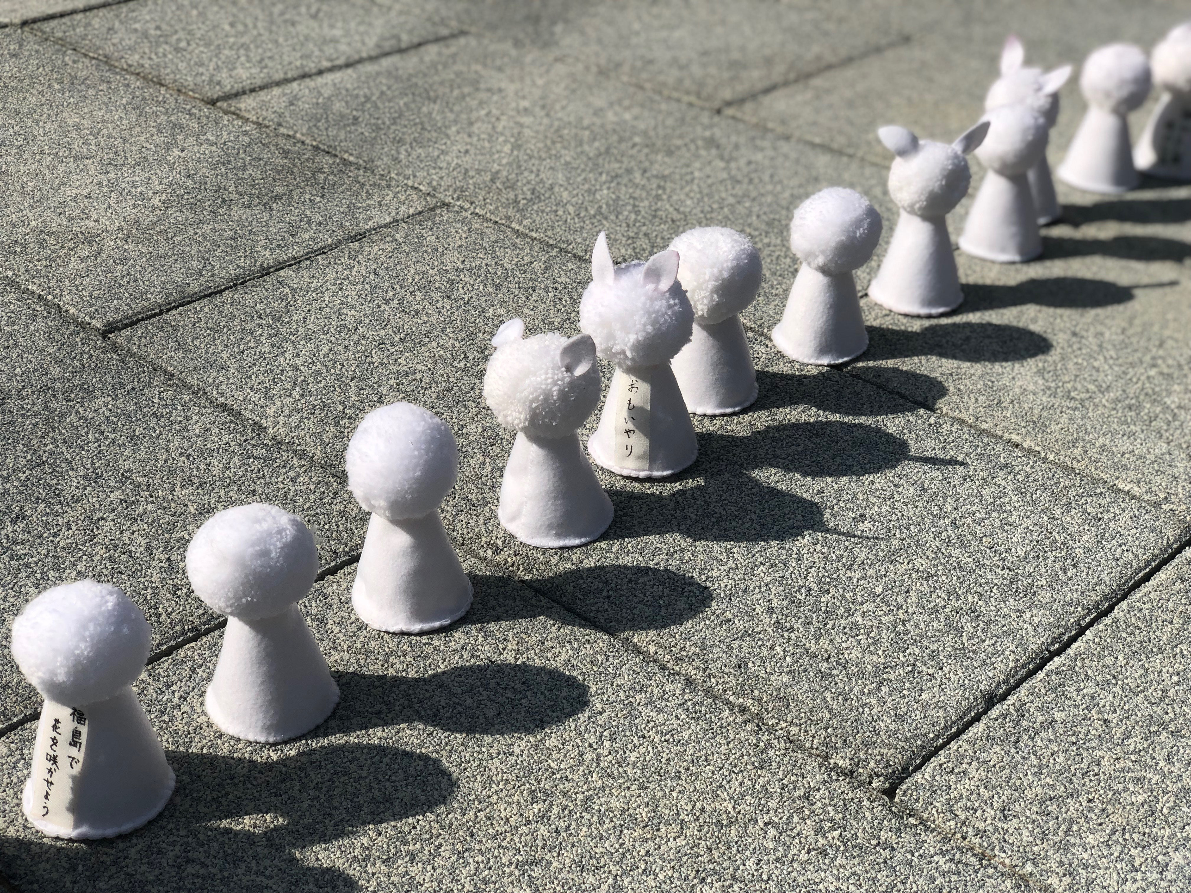 We did not know exactly what we would "make" until we were in Fukushima. Meeting locals and hearing their personal stories about the Daiichi nuclear disaster was very important before deciding anything. We knew we wanted to work in multiples (creating a lot of one thing) and eventually decided to make soft sculptures inspired by the white rabbit and regional kokeshi dolls that people could leave their own "Don't forget..." message on the back seam. We fine tuned the process of making them so even children could help.