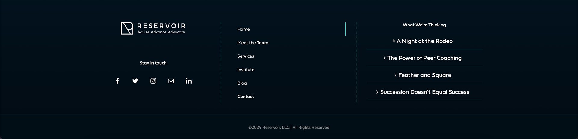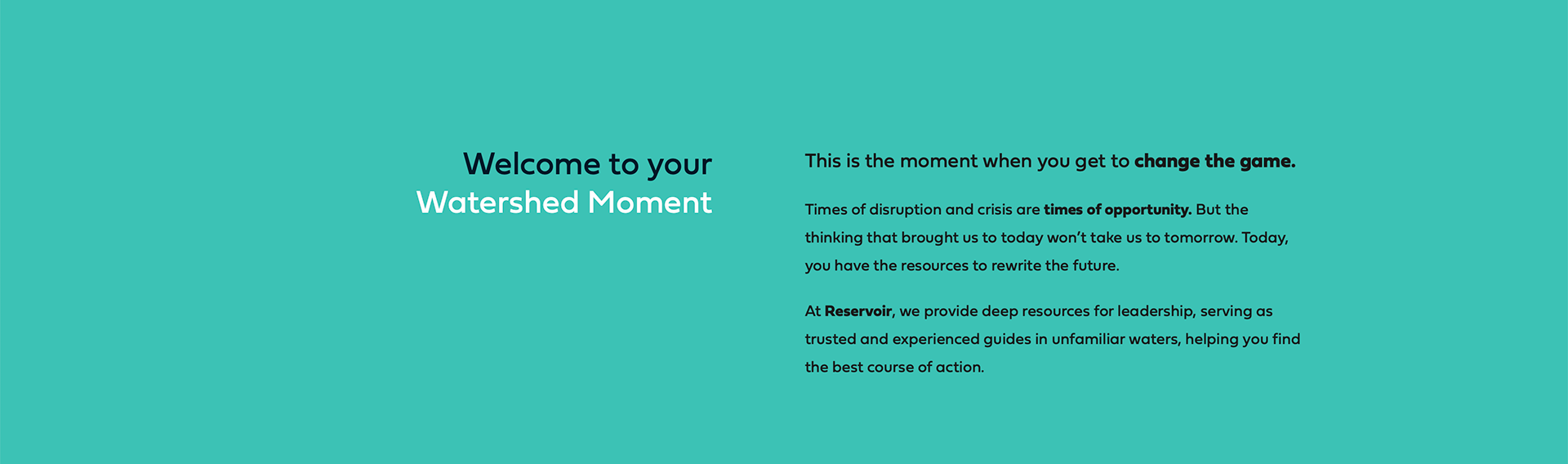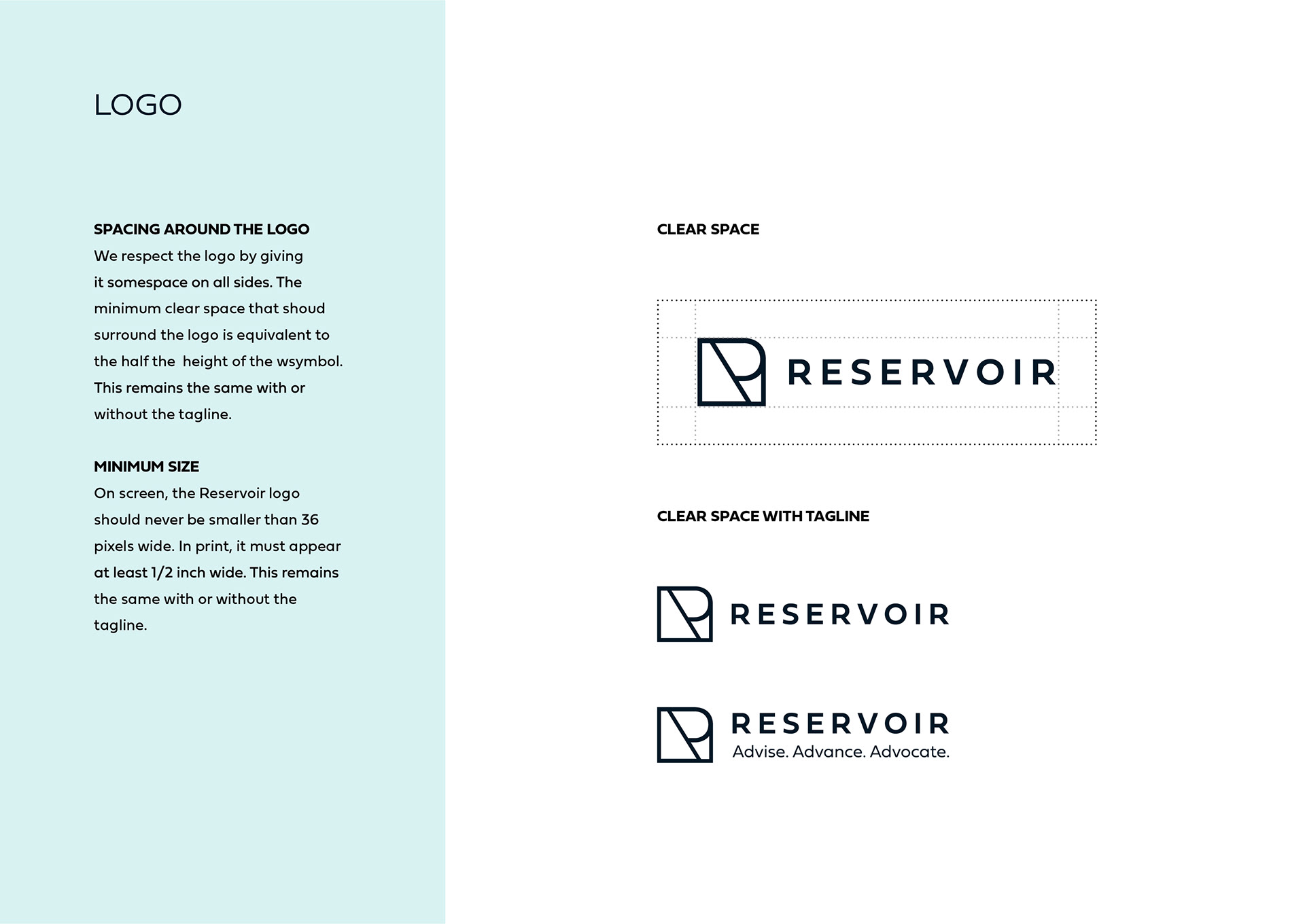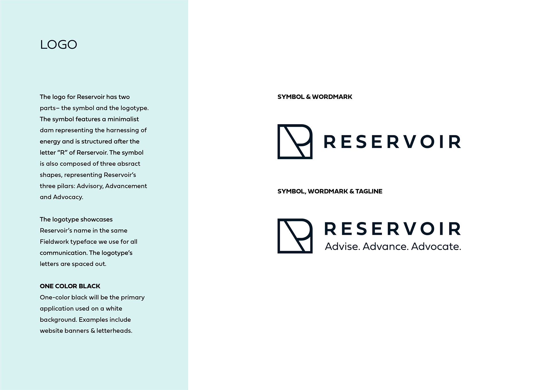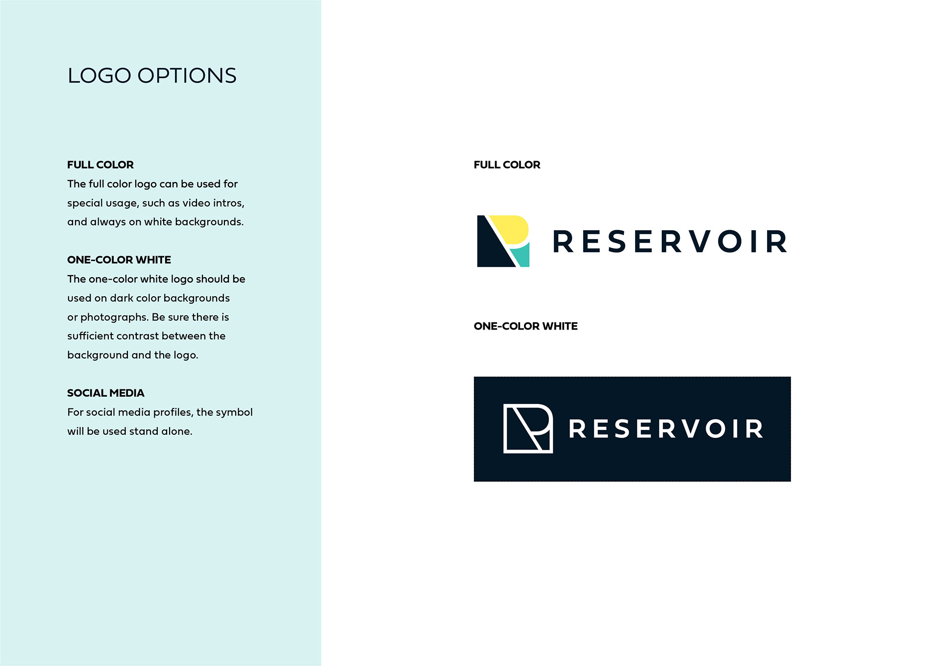 Reservoir LLC is a management consulting firm whose brand identity I designed from the ground up. Deliverables included a new logo, color system, typeface, family of imagery, and animated logo for video intros, all of which were outlined in a style guide provided to the web designer.